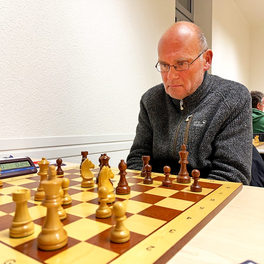 Am Spitzenbrett siegte Serhii Savian nach scharfem Gambit-Spiel, Stefan Janz an Brett 2 führte zwei Mehrbauern im Turmendspiel zur Dame. Ralf Westhues an Brett 3 remisierte in nicht ganz ausgekämpfter Stellung, Peter Weng an Brett vier gewann schon früh eine Mehrfigur und anschließend auch die Partie. Dietrich Füllborn an Brett 5 hatte ebenfalls Mehrmaterial, das er zum Sieg führte, ähnlich lief es bei Roman Hontariev an Brett 6. Bernfried Specht (Foto) am siebten Brett setzte sich positionell durch, während Florian Langhorst an Brett 8 einen Mattangriff startete.