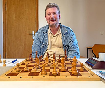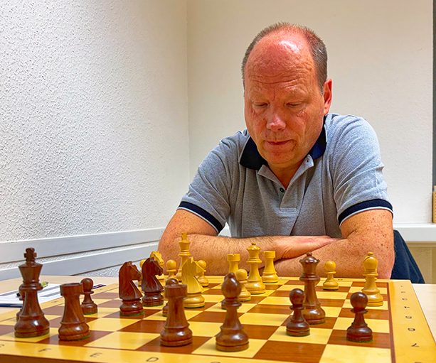 Für uns war es der bislang sicherste Erfolg in der laufenden Spielzeit. Nach vielen knappen wie umkämpften Begegnungen an den vorangegangenen Spieltagen stand diesmal am Ende ein klarer Sieg. Schon frühzeitig stellte am Spitzenbrett Serhii Savian die Weichen auf Sieg. So hatte sich sein Gegner auf gefährliche Fesselungen eingelassen, die ihm schließlich auch zum Verhängnis wurden. Unser Kapitän Peter Weng (Foto) hatte einen fulminanten Königsangriff inszeniert; am Ende drohte er undeckbar schachmatt, sodass sein Gegner aufgab. Mika Greve hatte einen Bauern ins Geschäft gesteckt, dafür aber drei gegnerische eingeheimst. Das abschließende Turmendspiel mit zwei Mehrbauern brachte er souverän nach Hause. Dietrich Füllborn hatte sich eine bessere Stellung erarbeitet und einen Mehrbauern erkämpft. Da sich aber noch etliche Steine, darunter die Damen, auf dem Brett befanden, bahnte sich eine langwierige Fortführung der Partie an. Doch dann übersah der Dülmener eine einzügige Mattdrohung; dieses Geschenk ließ sich Dietrich natürlich nicht entgehen. Ralf Westhues war damit beschäftigt, die Löcher rund um seinen König zu stopfen. Doch gelang ihm das nicht auf Dauer, letztlich setzte sich sein Gegner siegreich durch.
